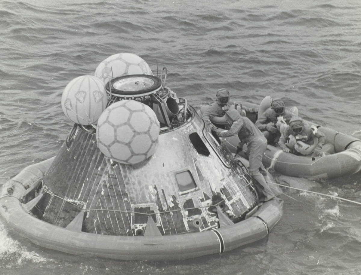 The Astronauts were given biological isolation garments and assisted them in getting out of Columbia. With the possibility of bringing back pathogens from the lunar surface, they were scrubbed with sodium hypochlorite and then were taken to Hornet, where they began their 21 days of quarantine.